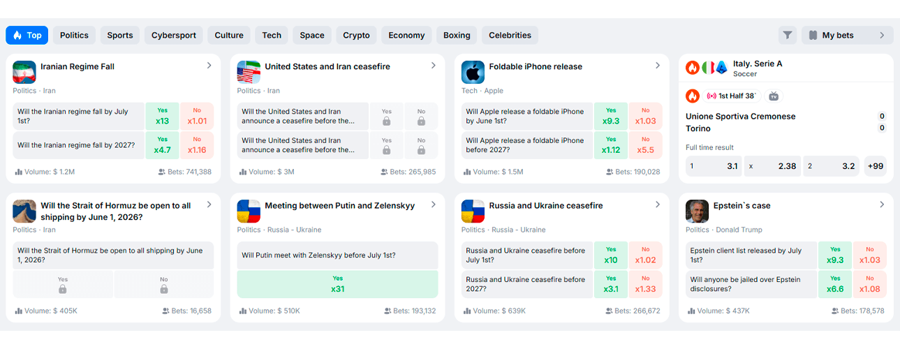 One of the most active market categories. Users can bet on presidential and parliamentary elections worldwide, approval ratings, political appointments, new laws or international treaties, and major policy decisions. Political markets attract high volume because outcomes are publicly verifiable.
